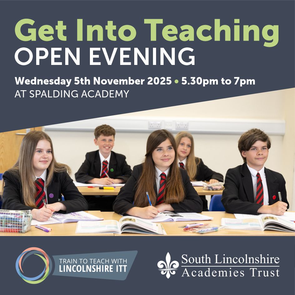 We will be holding a ‘Get Into Teaching’ event on Wednesday 5th November 2025 from 5.30pm to 7.00pm at Spalding Academy, where you will discover how you can gain a recognised teaching qualification with our one-year school centred Initial Teacher Training.